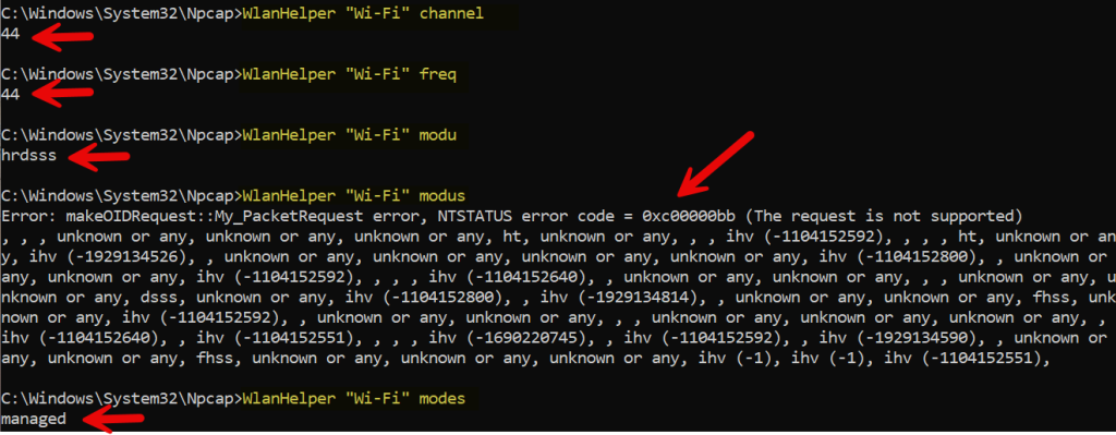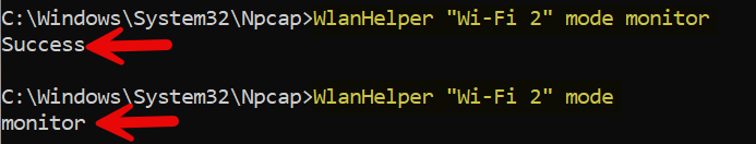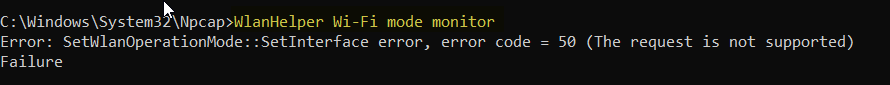 I received a “Failure” error: the request is not supported. When I tried this, I was on the Wi-Fi network. But that may not be the reason. Depending on my network, my OS, the drivers, the NIC itself, I may not be able to do this. That is why I strongly recommend using an external USB Wi-Fi adapter that supports monitor mode (look here).