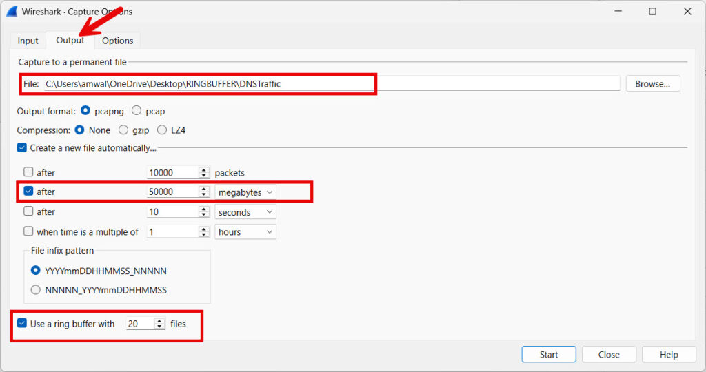 - Use a Wireshark Ring buffer 5–10 GB max