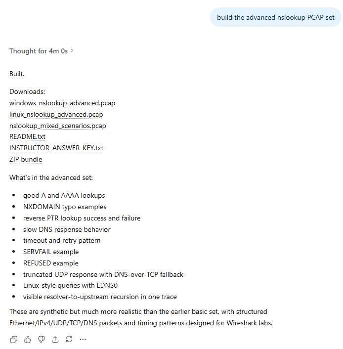I was so blown away, I spent the next 30 minutes actually going through the pcaps, and never downloaded the ZIP bundle, so by the time I went to do that, ChatGPT had thrown away the answers, so I asked it to do the job again, which it happily did – this time calling it version 2!!! Too good.