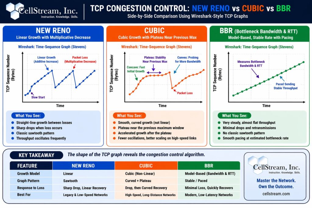 Short answer: you cannot directly “see” TCP CUBIC as a field or flag in Wireshark. TCP does not signal its congestion control algorithm on the wire. What you can do is infer CUBIC behavior from traffic patterns and graphs—especially the evolution of the congestion window and throughput over time.